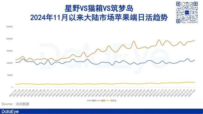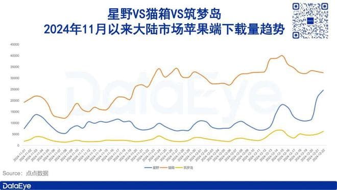 点点数据显示,星野在11月下旬至12月中旬,大陆市场苹果端下载量非但没有明显上升,反而有下降趋势,直至近日才有回升;日活数据与下载量基本一致,有轻微下滑。