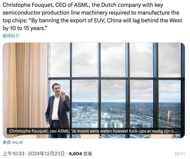12月26日消息,硅基世界获悉,据荷兰《新鹿特丹报》(NRC),ASML(阿斯麦)首席执行官克里斯托夫·富凯(Christophe Fouquet)日前表示,由于美国对华禁止出口EUV光刻设备,相比英特尔、台积电和三星等行业巨头相比,中国芯片技术将落后西方10到15年,主要还是因为美国禁止出口EUV(极紫外光)设备,导致中国无法获得尖端光刻机。