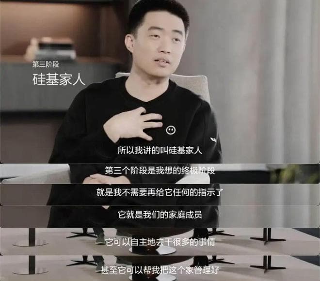 第三个阶段,是李想认为的人工智能AGI的终极阶段,李想称之为“硅基家人”。