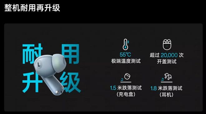 该款耳机通过莱茵电池耐用认证,官网展示其通过“55℃极端温度测试、超过 2 万次开盖测试、1.5 米跌落测试(充电盒)、1.8 米跌落测试(耳机)”。
