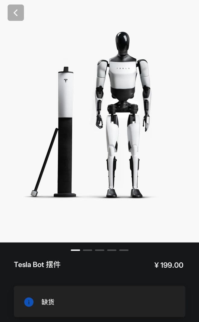 12 月 26 日上午 10 时,特斯拉 Tesla Bot 人形机器人摆件正式对外发售,定价为 199 元。仅不到 15 分钟时间,其官方 APP、第三方电商平台官方旗舰店上这款产品均宣告售罄,显示「缺货」「下架」状态。其客服人员表示,确实被抢光了。对于后续还会否上架,目前没有收到补货通知,建议后续关注下。
