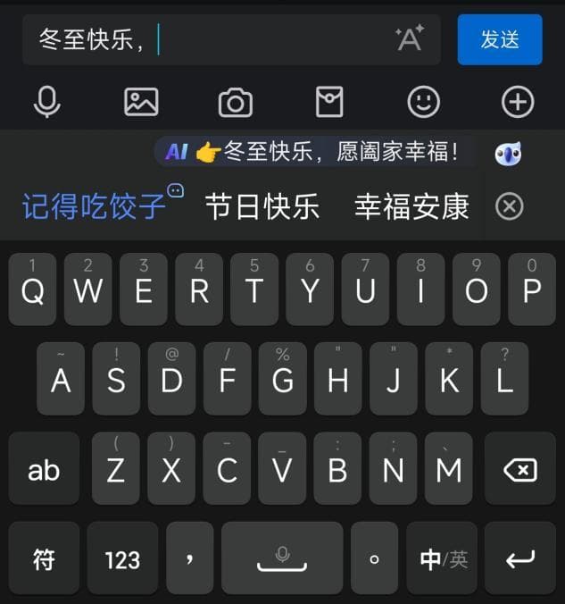 先看讯飞的“联想”和“预测”,当我向对方发出“冬至快乐”时,讯飞输入法的输入框就能自动联想出“记得吃饺子”,也给出了“冬至快乐,愿阖家幸福”的选项,点击下去就能出来一句寒暄,不仅省下了输入的时间,还能给我一些聊天灵感。