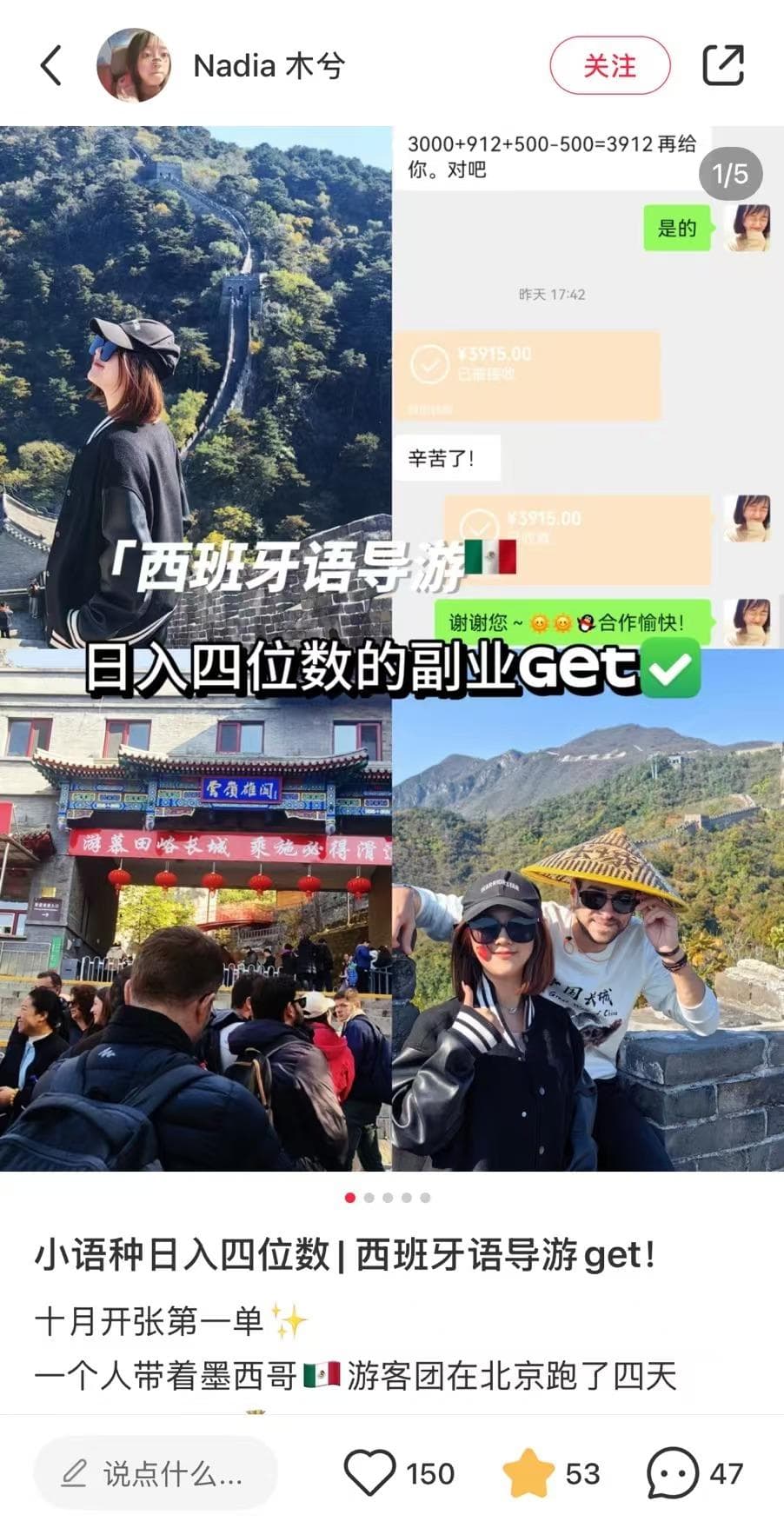 “西班牙语导游,日入四位数的副业。”今年10月,赵文钰在北京带一个墨西哥游客团跑了四天后,在自己的小红书账号“Nadia木兮”开心地发布了这篇笔记。