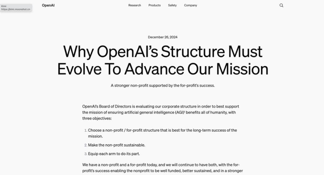 随着我们进入 2025 年,我们必须不仅仅是一家实验室和初创公司,还必须成为一家经久不衰的公司。董事会在咨询外部法律和财务顾问后,正在考虑如何最好地构建 OpenAI,以推进确保 AGI 造福全人类的使命,其目标是: