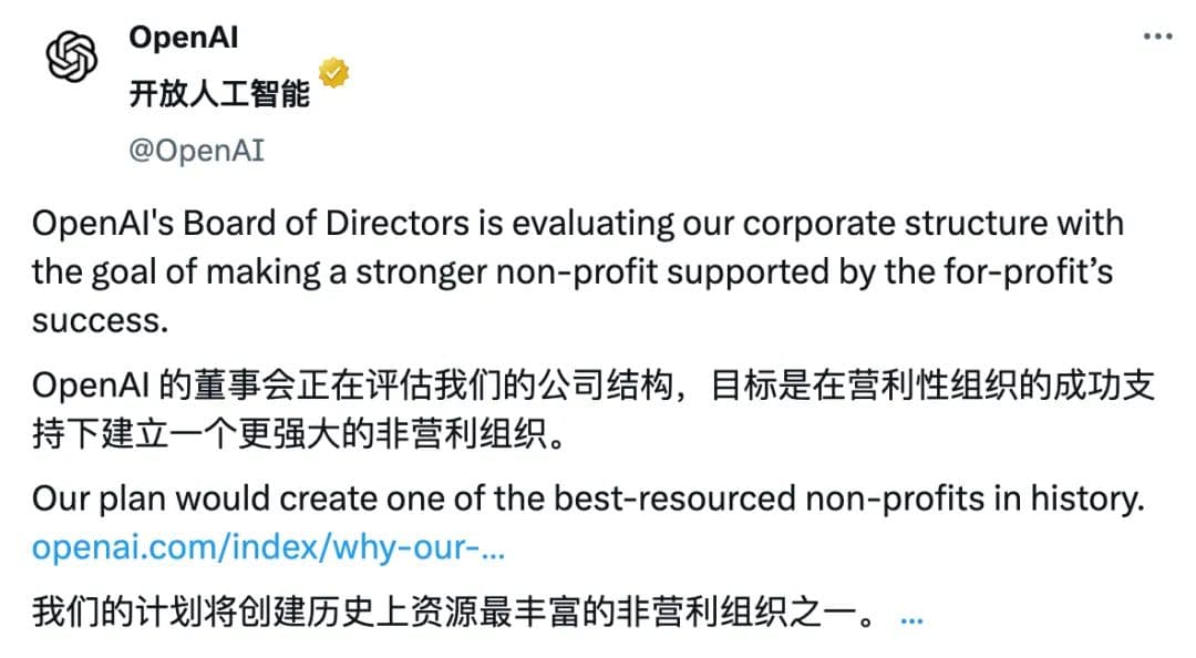 OpenAI 的董事会正在评估我们的公司结构,其目标是建立一个由营利公司成功支持的更强大的非营利组织。 我们的计划将打造历史上资源最充足的非营利组织之一。