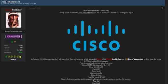 黑客组织 IntelBroker 披露 10 月入侵思科公司所获“机密文件”