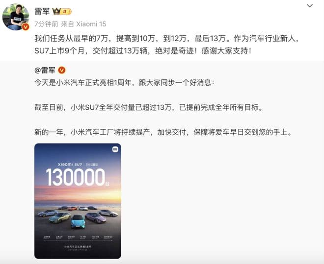 雷军在微博中表示:「我们任务从最早的 7 万,提高到 10 万,到 12 万,最后 13 万。作为汽车行业新人,SU7 上市 9 个月,交付超过 13 万辆,绝对是奇迹!感谢大家支持!」(来源:证券日报)