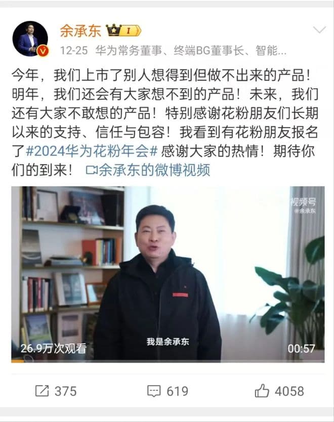12月25日,华为常务董事、终端业务董事长、智能汽车解决方案BU董事长余承东在微博上表示:“今年,我们上市了别人想得到但做不出来的产品。明年,我们还会有大家想不到的产品。未来,我们还有大家不敢想的产品。”