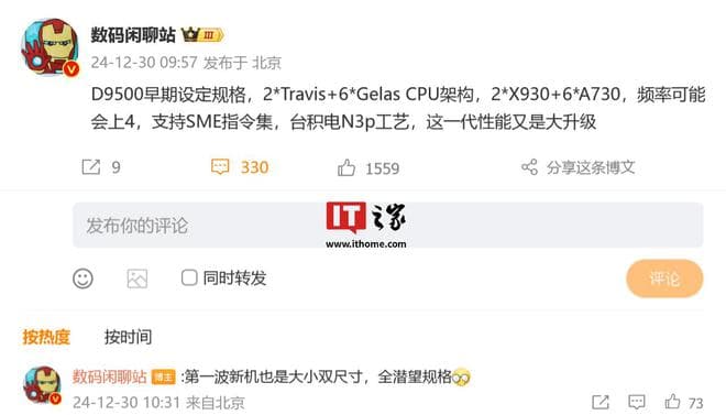IT之家 12 月 30 日消息,消息博主@数码闲聊站 今日分享联发科预计于 2025 年下半年发布的天玑 9500 旗舰移动 AP(应用处理器)的早期设定规格。