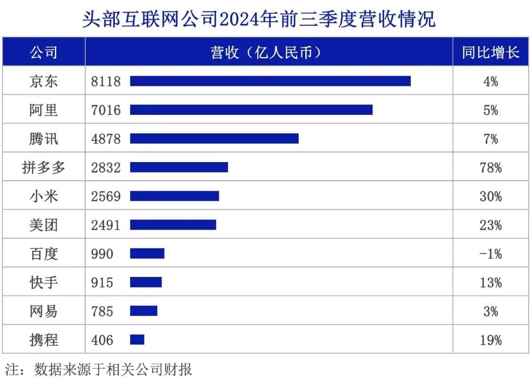 以下是10家互联网公司2024年前三季度的营收排名和同比增速。