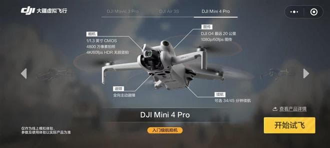 目前,该虚拟飞行小程序中可选 DJI Air 3S、DJI Mini 4 Pro、DJI Mavic 3 Pro 三款无人机,除了“一键试飞”外,用户也可以点击购买直接跳转至大疆小程序下单无人机。