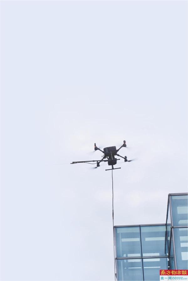 深圳罗湖一公司推出一项创新技术,无人机与机器人合作可以在上百米的高空进行玻璃幕墙清洗。 南都记者 冷锋 摄