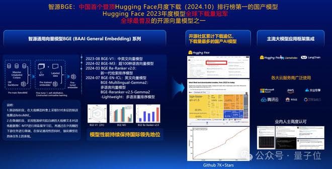 去年,我们发布的通用向量模型被广泛用在检索增强中,在过去的两年里,BGE已经成为全球知名开源平台Hugging face上120多万个开源AI模型中下载量最高的模型(超过20%)。