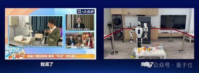 在今年两会央视连线智源研究员时,研究员说“我渴了”,机器人的机器手臂上的摄像头叠加多模态大模型,它就能够去理解、思考、抓取透明物体。