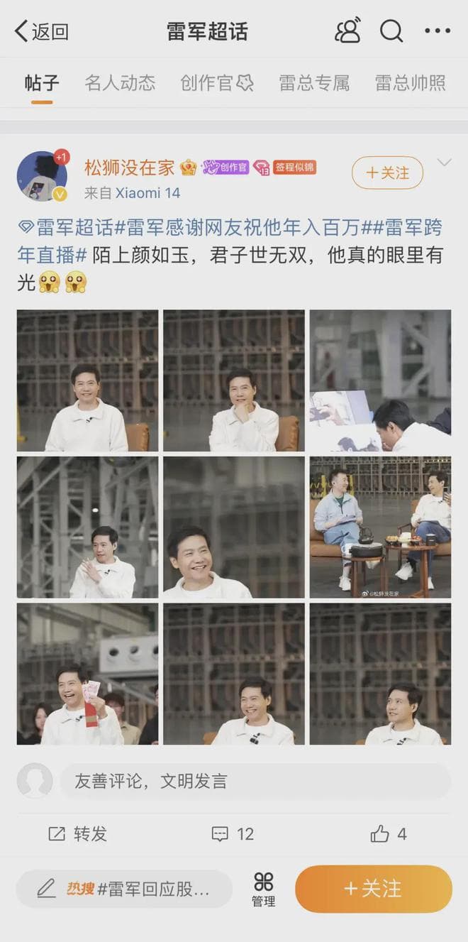 在微博的雷军超话下,78万“雷粉”每天兢兢业业地关注和分享着雷军的行程、穿搭、金句和高光时刻,在他的“帅照”下热忱地赞叹“陌上人如玉,君子世无双,他真的眼里有光”,夸他亲手做的糖葫芦是“小米第一甜”。置顶的粉丝守则中特别要求大家“理性追星”,禁止使用“爸爸”“老公”等称呼。