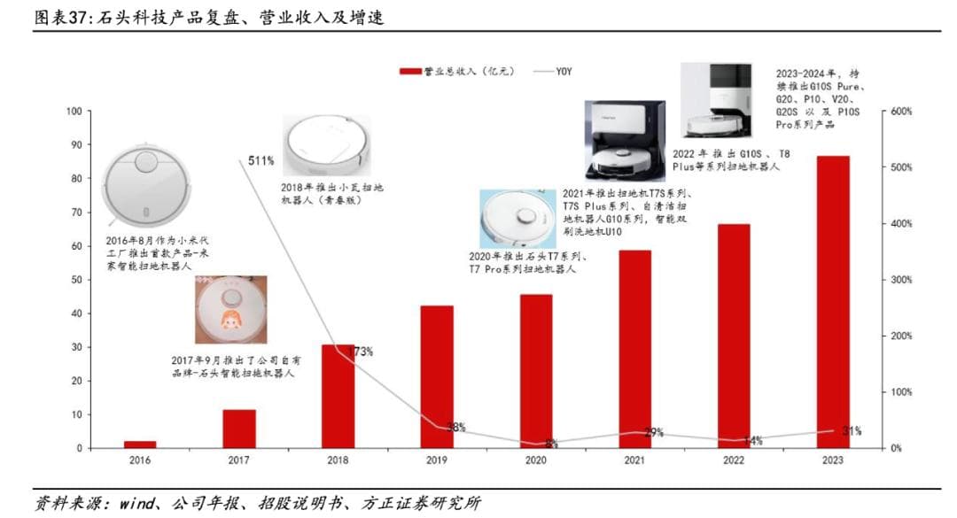 一方面,如上文所述,石头科技主营业务的业绩表现并不理想,三季度归属于上市公司股东的净利润下滑了43.40%。其他的多元业务尝试也不算成功,2023年,其87亿总营收中,扫地机器人就贡献了81亿元。方正证券预测,今年其营收将达到113亿元左右,其中扫地机器人将贡献其中的105亿。