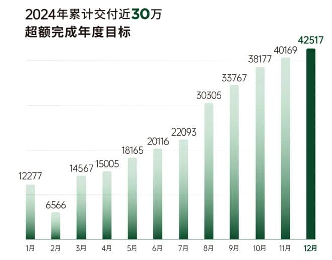 自2024年下半年开始,零跑汽车的交付量呈现持续上升态势。2024年12月,零跑汽车的交付量达42517辆,连续两个月突破4万辆,同比增长128%,并且连续七个月创新高。
