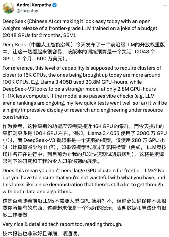V3 一发布, OpenAI 创始成员 Karpathy 直接看嗨了,甚至发出了灵魂提问,难道说大模型们压根不需要大规模显卡集群?
