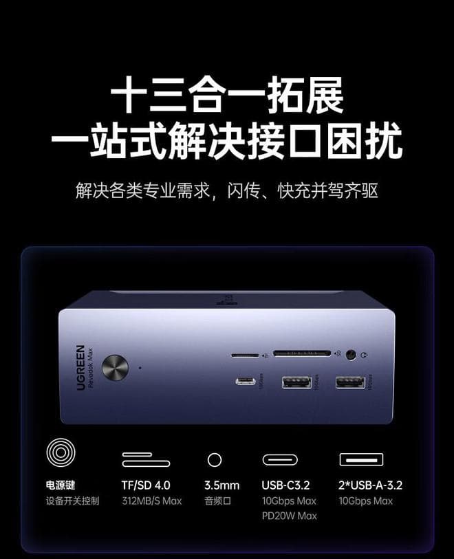 绿联雷电 5 扩展坞为十三合一拓展,接口如下: