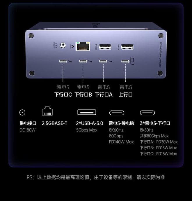 绿联雷电 5 扩展坞主控芯片为 JHL 9480;文件传输速率最高 80Gbps;视频传输带宽最高 120Gbps;支持动态分配充电功率,可实现多设备同时快充;扩展坞采用氮化镓充电器(180W)。
