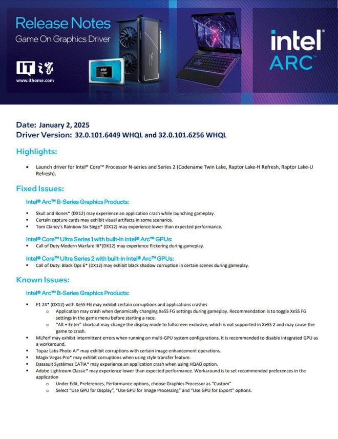 IT之家 1 月 3 日消息,英特尔今日发布了最新的 Arc 显卡 32.0.101.6449/6256 WHQL 驱动程序。