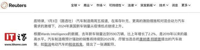 IT之家 1 月 4 日消息,路透社援引分析公司 Wards Intelligence 数据,2024 年(去年)美国新车销量达 1590 万辆,同比增长 2.2%,创下 5 年来新高。通用汽车为去年美国销量最高的车企,售出 270 万辆,同比增长 4.3%。此外,丰田汽车去年在美国销量增长 3.7%,福特汽车增长 4.2%。