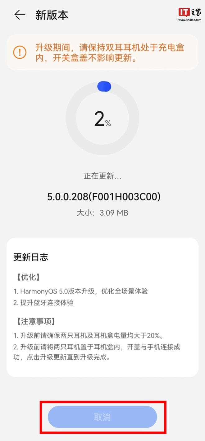 IT之家 1 月 5 日消息,华为 FreeBuds 5 无线降噪耳机现开启鸿蒙 HarmonyOS 5.0.0.208 版本升级,官方称预计将于 1 月 12 日前完成全网推送。