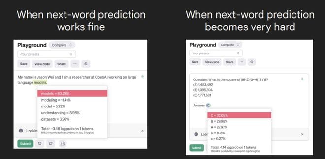 比如下图左侧就给出了一个下一词预测效果很好的例子,这里很容易预测出最后一个词是 models。而对于右侧的数学题,仅仅通过下一词预测很难得到正确答案是 A、B、C 中的哪一个。