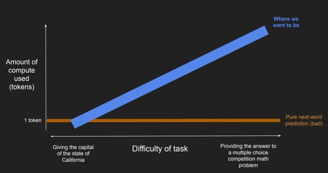 这里要强调的是,任务是有难度区分的。如果单纯使用下一词预测,那就是使用相同的计算量来解决非常简单的任务和非常困难的任务。