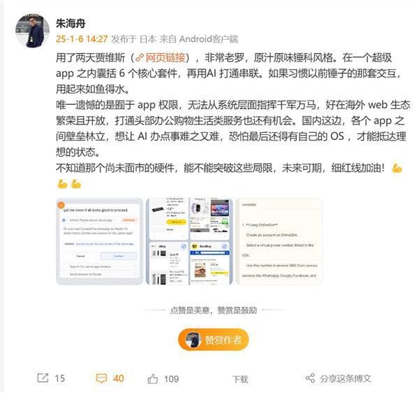 朱海舟还表示,不知道那个尚未面市的硬件能不能突破这些局限,未来可期,细红线加油。