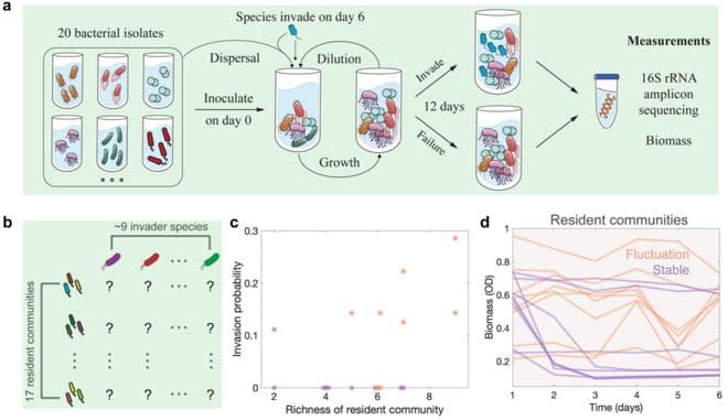图丨微生物群落的实验显示,震荡群落的入侵概率高于稳定群落,导致了正向的多样性易入侵性关系(来源:Nature Ecology & Evolution)