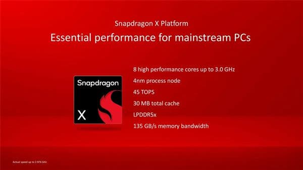 该芯片采用台积电4nm工艺制造,采用高通Oryon架构,最高频率可达3.0 GHz,与8核的骁龙X Plus处理器相比CPU频率稍低。