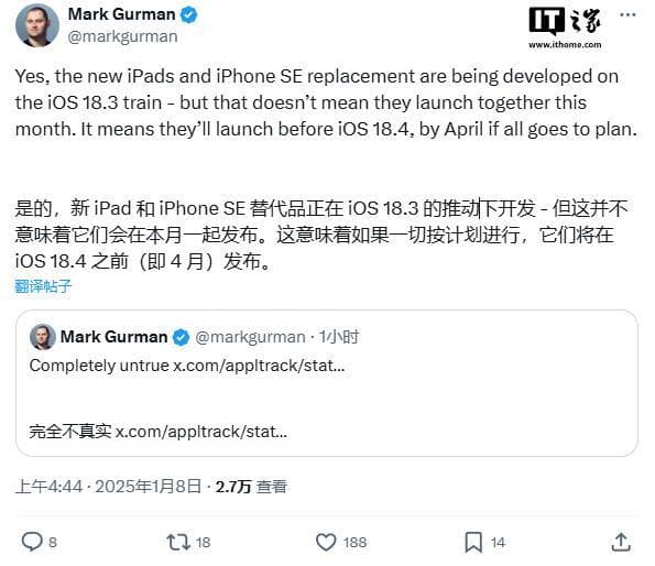 IT之家 1 月 8 日消息,彭博社马克・古尔曼刚刚针对“苹果新款iPhone SE 4 和 iPad 11 将于今年 4 月随iOS 18.3 和 iPadOS 18.3 一起发布”的爆料发表了回应。
