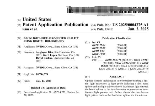 近日,美国专利局公布了一项英伟达提交的新型专利,这项名为“无背光增强现实数字全息技术”的专利描述了一种新的AR显示技术,旨在降低AR眼镜重量的同时提供更好的显示效果。