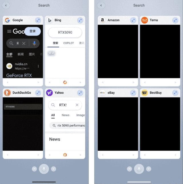 输入问题并点击上方的网站图标就能直接得到搜索结果,比方说,我搜索了昨天发布的 RTX 5090,响应后,系统能在数秒内并列展示来自不同渠道的搜索结果,中英文输入都能得到准确响应。