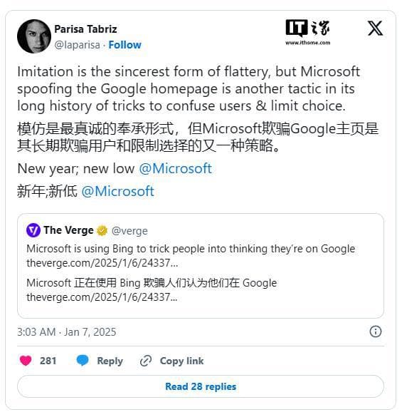 这一做法迅速引发了广泛批评,甚至引起了谷歌高管的关注。谷歌 Chrome 副总裁 Parisa Tabriz 罕见地公开指责微软,甚至直接在社交媒体上 @了微软,称其欺骗用户,非常 Low。像这样高级别的员工就此类尚未证实的指控发表评论的情况并不常见,其表态也被视为谷歌对微软此举的不满。