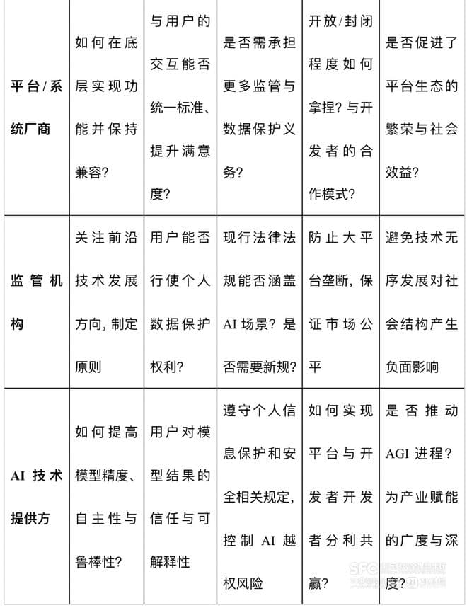 若要将上述维度融为一体,可采用“多主体—多维度交叉”的分析框架。主体包括用户、开发者、平台/系统厂商、监管机构、AI 技术提供方;维度则涵盖技术进化、用户体验/隐私、安全/合规、竞争/生态以及社会影响。