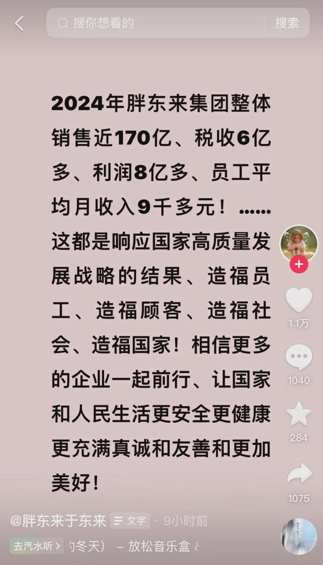 【胖东来2024年利润超过8亿元,员工月均收入超9000元】胖东来创始人于东来在社交平台上公布,2024年胖东来集团整体销售近170亿元、税收超6亿元、利润超8亿元、员工平均月收入九千多元。此前的1月1日,于东来发布了2024年胖东来的经营数据。胖东来商贸集团2024年全年累计销售169.64亿元(许昌、新乡两地),12月单月集团累计销售20.41亿元。(华尔街见闻)