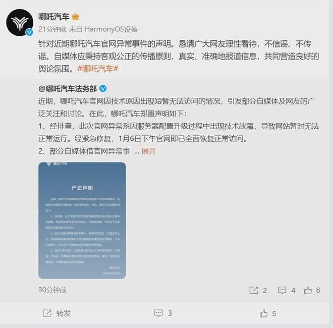 【哪吒汽车:部分自媒体借官网异常事件发布不实言论,已经取证并采取法律手段维护自身权益】哪吒汽车法务部在官微发文称,近期,哪吒汽车官网因技术原因出现短暂无法访问的情况,引发部分自媒体及网友的广泛关注和讨论。经排查,此次官网异常系因服务器配置升级过程中出现技术故障,导致网站暂时无法正常运行。经紧急修复,1月6日下午官网即已全面恢复正常访问。部分自媒体借官网异常事件,发布不实言论,严重误导公众。对恶意编造事实对哪吒汽车品牌造谣抹黑的部分自媒体,公司已经取证,并采取了必要的法律手段维护自身权益。(新京报)