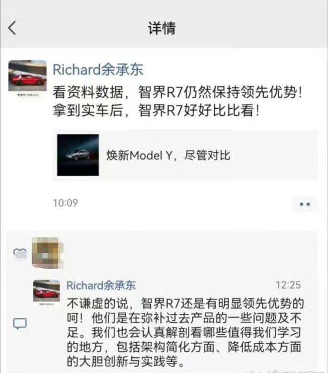 华为余承东评价特斯拉焕新 Model Y:智界 R7 依然保持领先优势