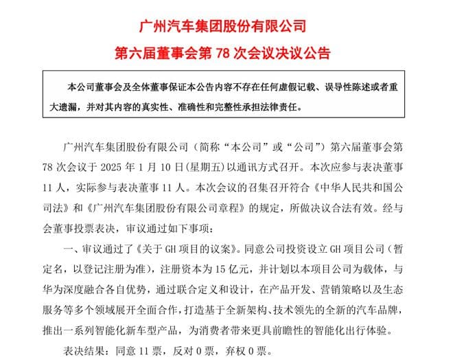 注册资本15亿元,广汽拟投资设立GH项目公司,与华为共同打造全新汽车品牌