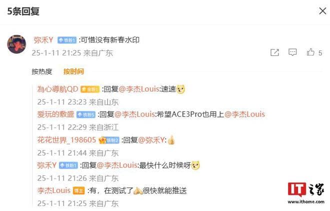 IT之家 1 月 12 日消息,一加中国区总裁李杰昨日针对是否会推出“新春水印”功能的相关问题作出回复,并称“有,在测试了,很快就能推送”。