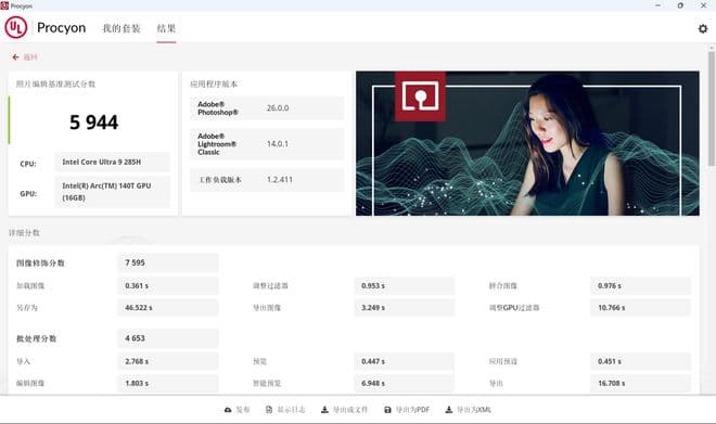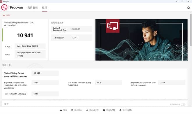 视频多媒体编辑方面,我们选择了 UL ProCyon 测试套件,并安装最新版本的 Adobe PhotoShop、Lightroom 以及 Premiere Pro。在照片编辑基准测试项目中,华硕灵耀 14 2025 综合分 5944 分;视频编辑基准测试得分 10941 分,虽然只有核显但基础的修图和视频剪辑工作流都能流畅运行。