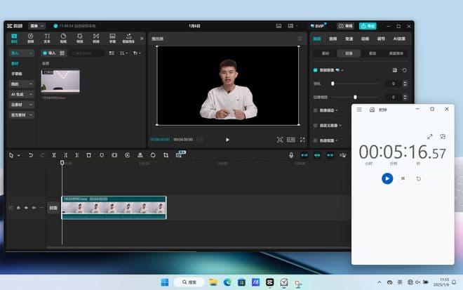 最后我们来看看华硕灵耀 14 2025 在 AI 方面的表现。首先是剪映的 AI 智能抠像功能,我们使用文件大小为 7.13GB 的 4K 视频素材、4 分钟时长、MOV 格式导入剪映,通过智能抠像功能处理,耗时 5 分 16 秒完成,这个效率制作一般的 Vlog 视频是够用的。