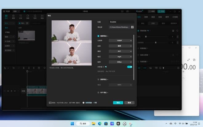 最终 4 分钟的视频不仅花费了一半不到的时间完成导出,还补到了 60 帧,文件大小也被压缩到 267mb,酷睿 Ultra 9 285H 拥有强大的编解码性能和 AI 算力,配合 2 个剪映内置 AI 效果的加持,普通用户和自媒体使用华硕灵耀 14 2025 完成视频剪辑体验舒适,效率很高。