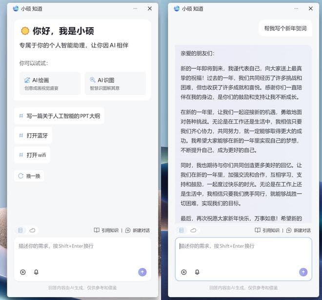 打开小硕知道后,它会以类似边栏的形式在屏幕右侧浮窗显示,主页上列举了一些功能入口和使用建议,底部是文字输入框,基本上目前主流 AI 智能助手该有的东西它都有。我们试着让它写一段新年贺词,几秒就生成了出来,用户可以根据生成的结果修改润色后使用。
