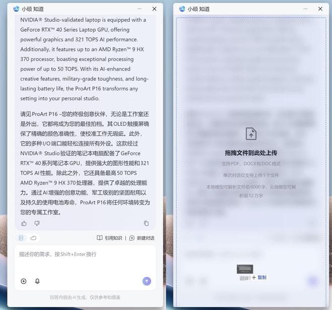 小硕知道不仅支持文声文、大纲和文体帮写功能,也支持对文案进行翻译,而且无需联网,本地模式即可操作。我们从华硕官网上复制了一段笔记本的英文介绍文案,小硕知道轻松翻译了出来,速度非常快,翻译准确性也不错,这对自媒体工作者来说可以极大提升创作效率。不过目前小硕知道仅支持识别文字内容或上传文档,不支持直接上传图片识图翻译,希望后续能够完善。