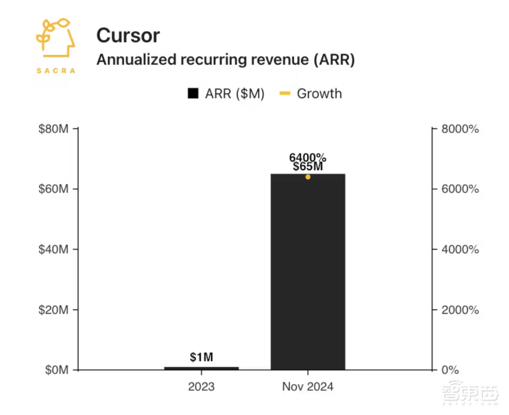 旺盛的AI编程需求已经转化成强烈的付费意愿。据TechCrunch报道,Anysphere的年化经常性收入(ARR)从4月到10月增长逾10倍,达到4800万美元。另据研究机构Sacra彼时的预测,Anysphere的ARR预计在11月超过6500万美元,同比增长64倍,月收入也已达到400万美元(约合人民币2920万元)。