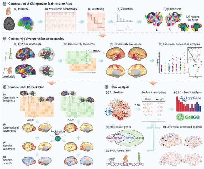 ChimpBNA 揭示了黑猩猩与人类大脑皮层连接模式的显著差异,尤其是在外侧颞叶和背外侧前额叶皮层,这表明大脑皮层演化中的连接性变化比以往认为的更复杂。