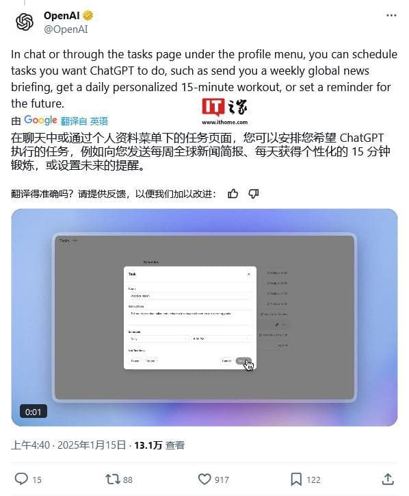 用户可以在聊天界面或个人资料菜单下的任务页面创建提醒。需要注意的是,使用该功能需要选择“4o with scheduled tasks”模型,该新模型正在逐步向订阅用户推送。IT之家附上演示视频如下: